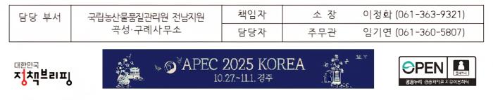 이정화 곡성‧구례 농관원 소장은 “추석 명절을 맞이하여 소비자가 우리 농식품을 믿고 구입할 수 있도록 원산지 표시 점검과 홍보를 강화할 계획이며, 소비자도 선물·제수용품 구입 시 원산지 표시를 꼼꼼히 확인하고 원산지 표시가 없거나 의심될 경우 전화(☏ 1588-8112) 또는 농관원 누리집(www.naqs.go.kr